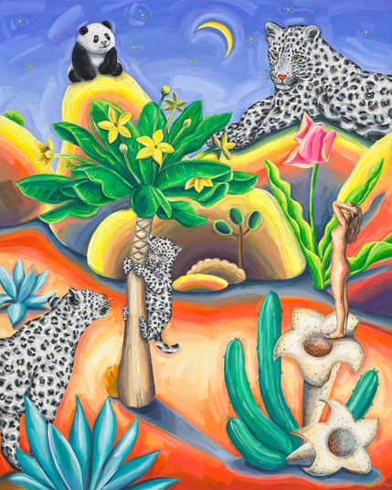 인간은 어디에서 와서 어디로 가는가? 아이라최 작가는 이러한 질문에 끝없이 물음표를 던지며 시공간과 생(生)에 얽매임이 없는 파라다이스를 그린다. 그림 속에는 한 작은 여인이 깎아지르는 바위산과 끝없는 사막을 걷고, 깊은 강물과 바다를 건너며 파라다이스를 향한 여정을 묵묵히 이어간다. 그가 도달한 궁극의 도착지는 드넓은 고원 사이로 만개한 꽃과 적도의 식물이 길게 뻗은 ‘오아시스’이다. 그곳에 살고 있는 신성한 표범들은 낙원을 지키는 유일한 맹수이자 사랑스러운 수호자이다. 표범의 코가 사랑스러운 하트 모양으로 변한 것은 싸울 일이 없어 사랑스러워진 모습을 표현한 것으로, 영원한 행복과 사랑이 존재하는 유토피아적 세계관을 나타낸다. 흔들리는 삶의 여정에 우연히 발견한 보물지도를 만난 것과 같이 작품을 통해 오아시스에 비친 자신을 마주하고, 묻어두었던 비밀의 파라다이스에 작은 파동이 일어나길 바란다.